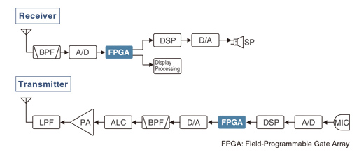 The IC-7300 employs an RF direct sampling system. RF signals are directly converted to digital data and processed in the FPGA (Field-Programmable Gate Array), making it possible to simplify the circuit construction. This system is a leading technology making an epoch in amateur radio.