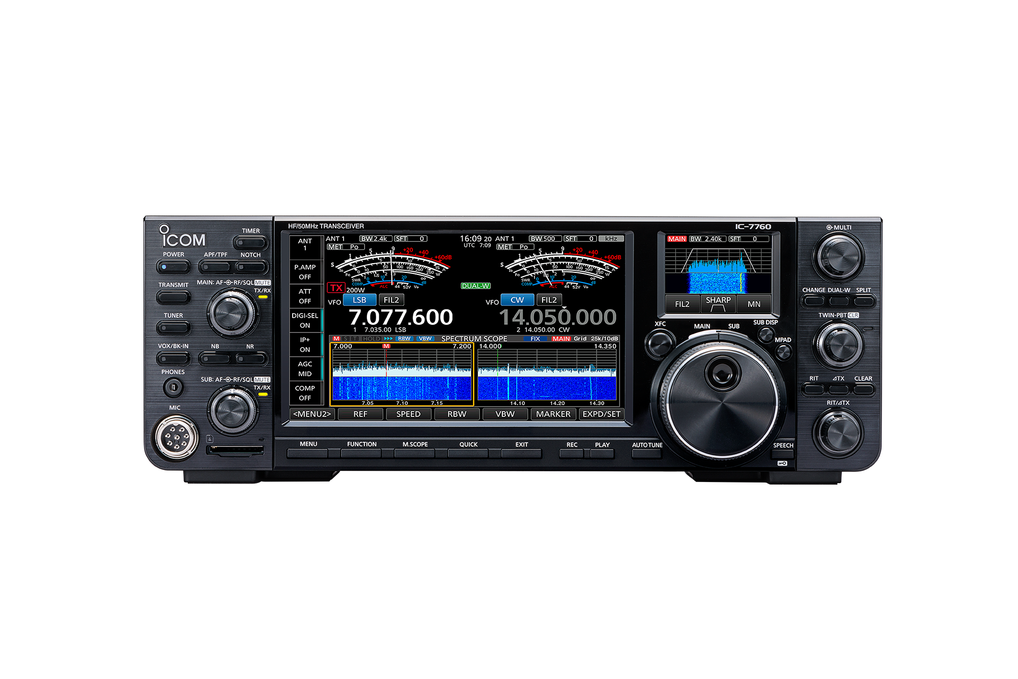 The IC-7760 has independent MAIN/SUB receivers, from the antenna to the speaker, so that one receiver section has no effect on the other, providing simultaneous reception of two signals in different bands/modes with identical performance. As with the IC-7851, dual spectrum scopes provide simultaneous display of the MAIN and SUB bands allowing the operator to see the changing band conditions.