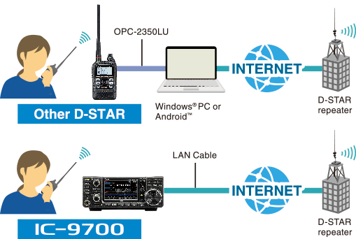 The IC-9700 has the D-STAR Repeater (DR) function that has been well received by D-STAR enthusiasts. The DR function can be used on both the Main and Sub bands simultaneously to listen to two separate DV signals. Moreover, by using the DD mode, you can browse the Internet through a repeater station.